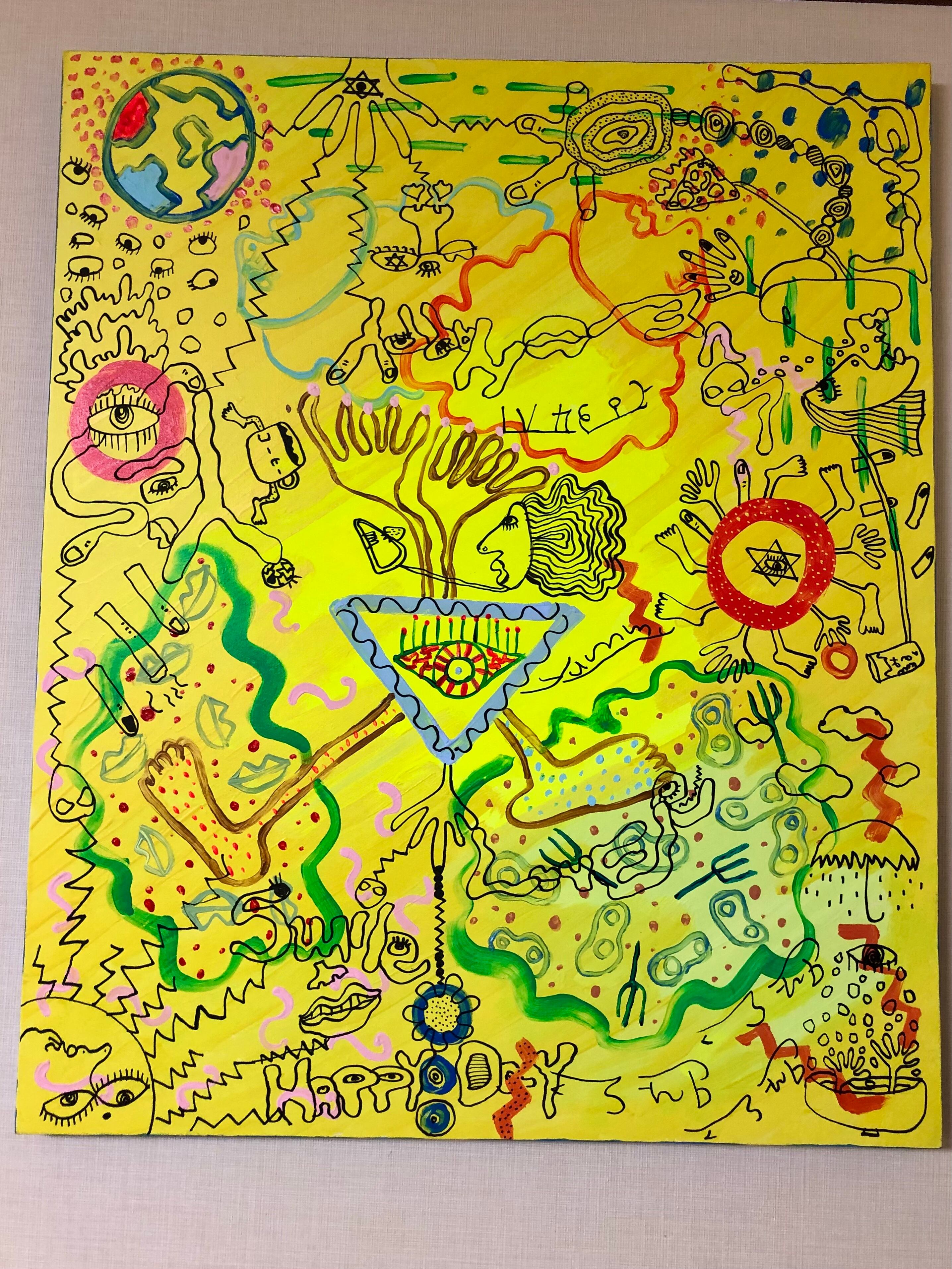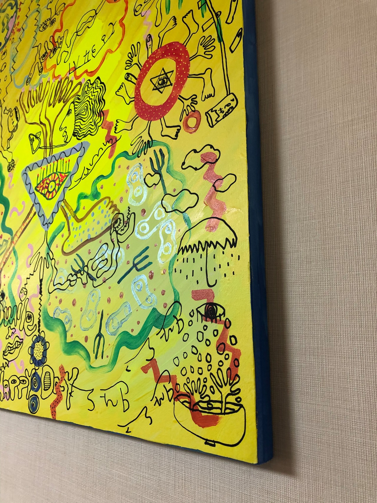 キャンバスにアクリル絵の具で描いた後に上からポスカで描いています。